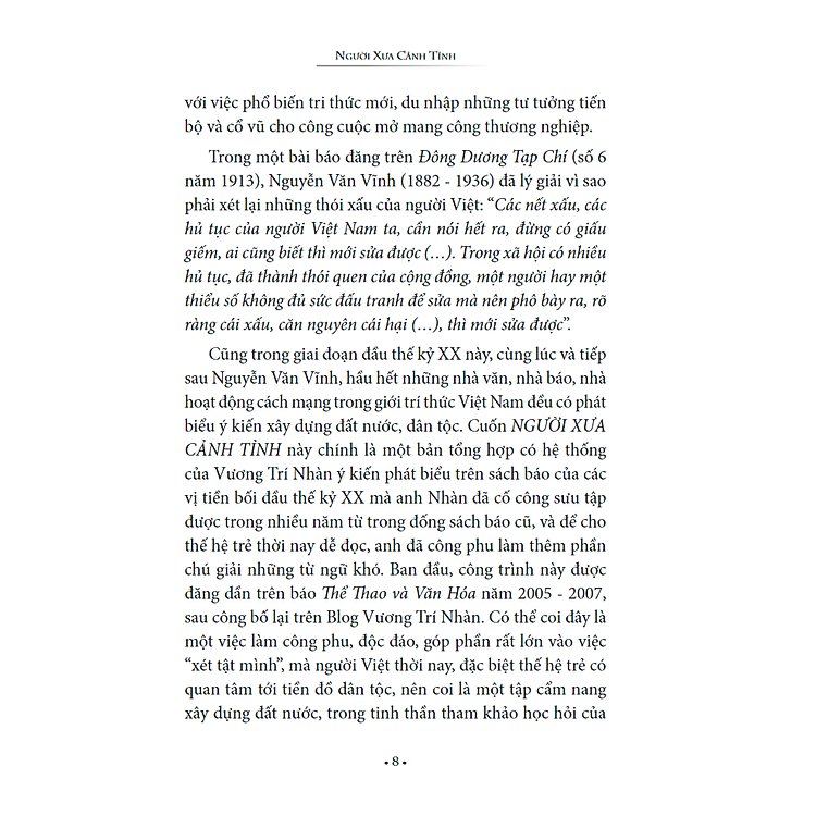 Nhà văn Vương Trí Nhàn sinh ra tại Hà Nội, học đại học sư phạm hệ 3 năm, tham gia viết sách báo từ tháng 3-1965. Cuốn “Người xưa cảnh tỉnh” này chính là một bản tổng hợp có hệ thống của Vương Trí Nhàn ý kiến phát biểu trên sách báo của các vị tiền bối đầu thế kỷ XX mà tác giả đã cố công sưu tập được trong nhiều năm từ trong đống sách báo cũ, và để cho thế hệ trẻ thời nay dễ đọc, tác giả cũng đã công phu làm thêm phần chú giải những từ ngữ khó. Có thể coi đây là một việc làm công phu, độc đáo, góp phần rất lớn vào việc “xét tật m.ình”, mà người Việt thời nay, đặc biệt thế hệ trẻ có quan tâm tới tiền đồ dân tộc, nên coi là một tập cẩm nang xây dựng đất nước, trong tinh thần tham khảo học hỏi của người xưa.