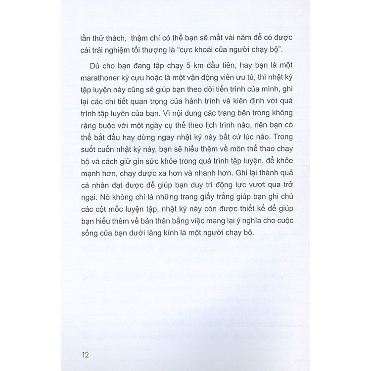 Trong suốt cuốn Nhật Ký 365 Ngày Chạy Bộ, bạn sẽ hiểu thêm về môn thể thao chạy bộ và cách giữ gìn sức khỏe trong quá trình tập luyện, để khỏe mạnh hơn, chạy được xa hơn và nhanh hơn. Ghi lại thành quả cá nhân đạt được để giúp bạn duy trì động lực vượt qua trở ngại. Nó không chỉ là những trang giấy trắng giúp bạn ghi chú các cột mốc luyện tập, nhật ký này còn được thiết kế để giúp bạn hiểu thêm về bản thân bằng việc mang lại ý nghĩa cho cuộc sống của bạn dưới lăng kính là một người chạy bộ.