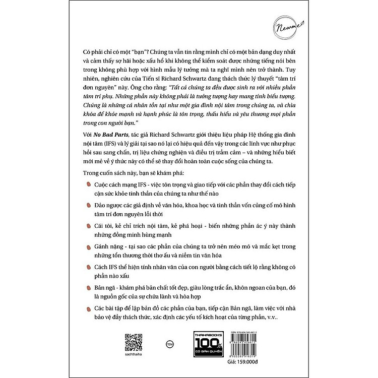 Với No Bad Parts, tác giả Richard Schwartz giới thiệu liệu pháp Hệ thống gia đình nội tâm (IFS) và lý giải tại sao nó lại có hiệu quả đến vậy trong các lĩnh vực như phục hồi sau sang chấn, trị liệu chứng nghiện và điều trị trầm cảm – và những hiểu biết mới mẻ về ý thức này có thể sẽ thay đổi hoàn toàn cuộc sống của chúng ta.