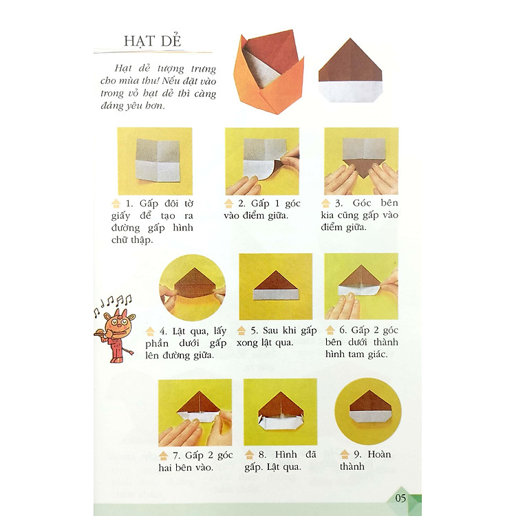Thông qua trò chơi xếp giấy, cha mẹ có thể dạy dỗ trẻ được nhiều điều hay: kích thích khả năng sáng tạo, rèn luyện tính kiên nhẫn và độ khéo léo của đôi bàn tay. Ngoài ra, việc gấp hình còn giúp nhận biết hình học, hình vuông, hình chữ nhật, hình tam giác, cách tạo ra hai hình vuô Origami Trò Chơi Gấp Giấy Dành Cho TE Tập 2 tập hợp các kiểu gấp giấy Origami thú vị cho bé: chong chóng, chuối tiêu, ghế ngồi, hạc giấy, chó sói, cá voi, du thuyề
