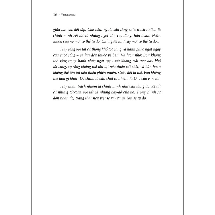 Với những chia sẻ đầy khai mở, cuốn sách “Tự do – Như chim tung cánh” giúp người đọc xác định những trở ngại đối với tự do của họ, có thể do hoàn cảnh hoặc do bản thân họ tự áp đặt, tìm thấy lòng dũng cảm để thành thật với chính mình. Và hãy lắng nghe lời Osho nhắn nhủ chúng ta: “Hãy sống với tất cả thống khổ tột cùng và hạnh phúc ngất ngây của cuộc sống – cả hai đều thuộc về bạn. Và luôn nhớ: Bạn không thể sống trong hạnh phúc ngất ngây mà không trải qua đau khổ tột cùng, sự sống không thể tồn tại nếu thiếu cái chết, và hân hoan không thể tồn tại nếu thiếu phiền muộn. Cuộc đời là thế, bạn không thể làm gì khác”.