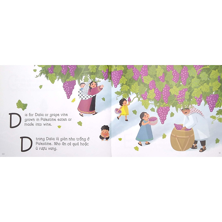 Palestine A to Z is in both English and Vietnamese. Its pages offer bright colorful illustrations of Palestinian daily life, with a touch of culture, cuisine and history, both ancient and modern.