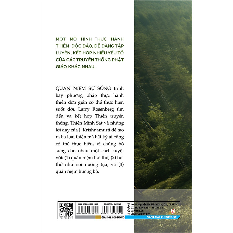 QUÁN NIỆM SỰ SỐNG trình bày phương pháp thực hành thiền đơn giản có thể thực hiện suốt đời. Larry Rosenberg tìm đến và kết hợp Thiền truyền thống, Thiền Minh Sát và những lời dạy của J. Krishnamurti để tạo ra ba loại thiền mà bất kỳ ai cũng có thể thực hiện, vì chúng bổ sung cho nhau một cách tuyệt vời: (1) quán niệm hơi thở, (2) hơi thở như nơi nương tựa, và (3) quán niệm buông bỏ.