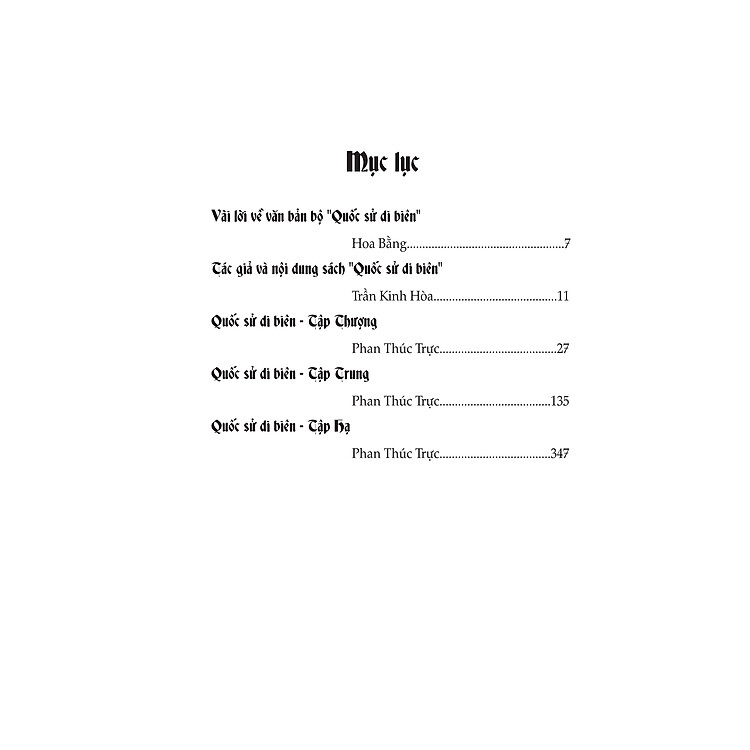 Quốc sử di biên ghi chép các sự kiện xảy ra trong giai đoạn 1802-1847, trải qua các đời Gia Long, Minh Mạng, Thiệu Trị; đề cập đến nhiều phương diện như: chiếu dụ, pháp lệnh, kiến chế, ngoại giao, xã hội, tập tụ Ngoài ra, sách còn chép khá tường tận về các nhân vật nổi tiếng trong lịch sử Việt Nam như Tuệ Tĩnh, Hà Tông Quyề Có nhiều chuyện nằm bên ngoài quốc sử triều đình Đại Nam thực lục, nên rất có giá trị nghiên cứu lịch sử. Hơn nữa, bản thân tác giả từng phục vụ trong nội các triều đình, từng giữ chức Thị giảng ở Viện Tập hiền và Kinh diên khởi cư trú nên rất am hiểu về các sự việc trong nội bộ triều Nguyễn, do đó, càng làm tăng thêm mức độ tin cậy của quyển sách này. Trong sách, Phan Thúc Trực ghi chú nhiều chỗ, liên quan đến các sự thật lịch sử.Giá sản phẩm trên Tiki đã bao gồm thuế theo luật hiện hành. Bên cạnh đó, tuỳ vào loại sản phẩm, hình thức và địa chỉ giao hàng mà có thể phát sinh thêm chi phí khác như phí vận chuyển, phụ phí hàng cồng kềnh, thuế nhập khẩu (đối với đơn hàng giao từ nước ngoài có giá trị trên 1 triệu đồng)…..