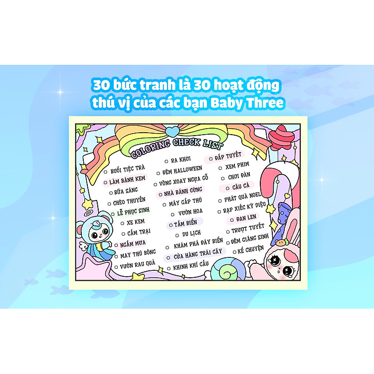 – Mỗi cuốn có 30 chủ đề tô màu phong phú đa dạng, mỗi bức tranh là một hoạt động đầy vui nhộn của bé Baby Three.