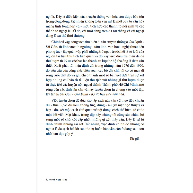 Chính vì vậy, công việc tìm hiểu di sản truyền thống ở Gia Định – Sài Gòn, từ lĩnh vực tín ngưỡng – tâm linh, văn học – nghệ thuật đến phong tục – tập quán vấp phải những trở ngại, trước hết là sự ít ỏi của nguồn tài liệu thư tịch liên quan và do vậy việc điều tra điền dã để thu lượm từ ký ức các bậc lão thành, từ lớp thế hệ cha ông là điều cần thiết. Xuất phát từ nhận định đó, trong những năm 1976 đến 1990, do yêu cầu của công việc biên soạn các bộ địa chí, tôi có cơ may đi rong ruổi đây đó và ghi chép thành một số bài viết dựa trên sự kết hợp những chỉ báo từ tài liệu thư tịch với những gì thu lượm được từ thực tế ở các huyện nội, ngoại thành Thành phố Hồ Chí Minh, mở rộng đến các tỉnh lân cận và nay tuyển chọn in chung vào một tập, lấy tên là Sài Gòn – Gia Định – Ký ức lịch sử – văn hóa.