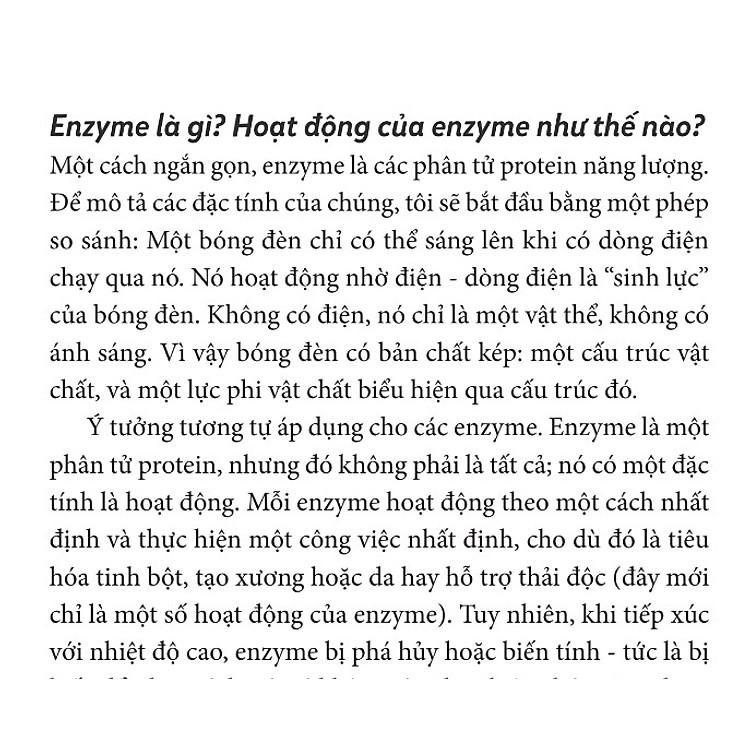 Bên cạnh đó, cuốn sách này cũng sẽ giải thích cho lý do tại sao một số liệu pháp có tác dụng và tại sao một số thì không – đó là do các enzyme. Cho bạn đọc cái nhìn toàn diện nhất từ chức năng của enzyme đến vô số lợi ích của chúng đối với sức khỏe và tuổi thọ con người. Nếu bạn quan tâm đến tuổi thọ, sức sống, sức khỏe toàn diện, giảm cân hoặc vượt qua bệnh tật – hoặc nếu bạn cảm thấy rằng sau nhiều năm bổ sung vitamin và khoáng chất, bạn vẫn chưa thực sự nhận được nhiều lợi ích như mong muốn thì cuốn sách này thực sự dành cho bạn.