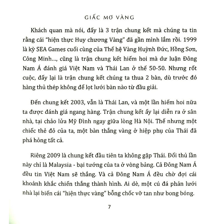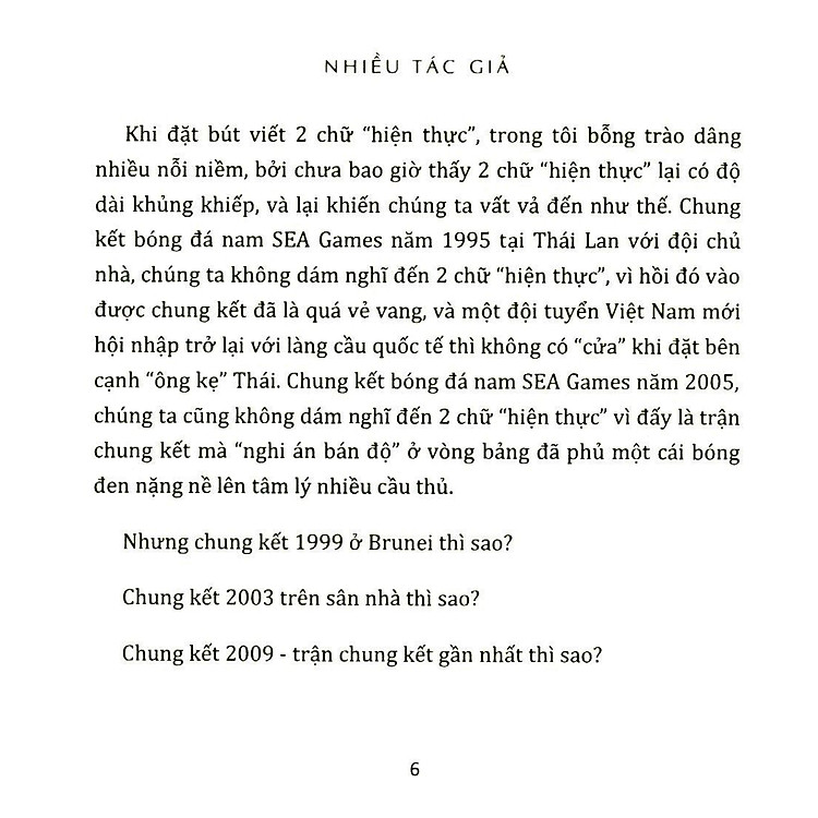 Khi đặt bút viết 2 chữ “hiện thực”, trong tôi bỗng trào dâng nhiều nỗi niềm, bởi chưa bao giờ thấy 2 chữ “hiện thực” lại có độ dài khủng khiếp, và lại khiến chúng ta vất vả đến như thế. Chung kết bóng đá nam SEA Games năm 1995 tại Thái Lan với đội chủ nhà, chúng ta đã không dám nghĩ đến 2 chữ “hiện thực”, vì hồi đó vào được chung kết đã là quá vẻ vang, và một đội tuyển Việt Nam mới hội nhập trở lại với làng cầu quốc tế thì không có “cửa” khi đặt bên cạnh “ông kẹ” Thái. Chung kết bóng đá nam SEA Games năm 2005, chúng ta cũng không dám nghĩ đến 2 chữ “hiện thực” vì đấy là trận chung kết mà “nghi án bán độ” ở vòng bảng đã phủ một cái bóng đen nặng nề lên tâm lý nhiều cầu thủ.”