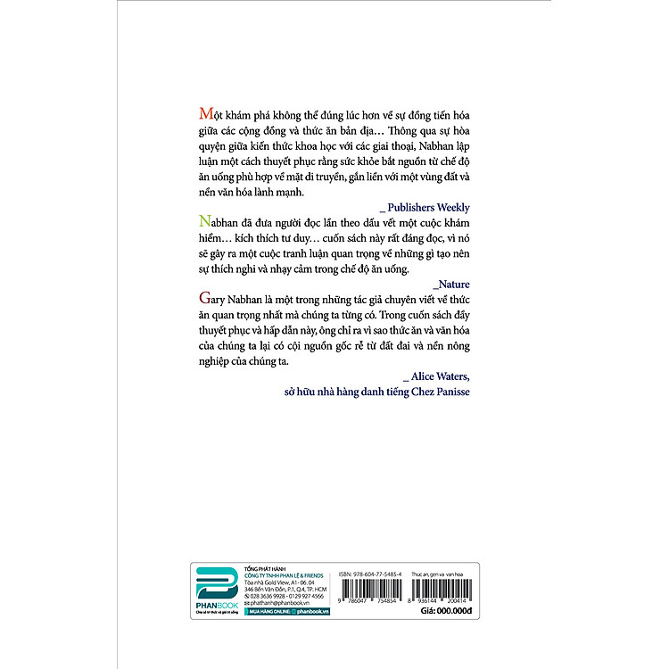“Gary Nabhan là một trong những tác giả chuyên viết về thức ăn quan trọng nhất mà chúng ta từng có. Trong cuốn sách đầy thuyết phục và hấp dẫn này, ông chỉ ra vì sao thức ăn và văn hóa của chúng ta lại có cội nguồn gốc rễ từ đất đai và nền nông nghiệp của chúng ta.” – Alice Water, sở hữu nhà hàng nổi tiếng Chez Panise.