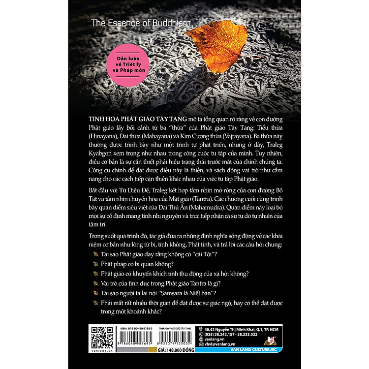 TINH HOA PHẬT GIÁO TÂY TẠNG mô tả tổng quan rõ ràng về con đường Phật giáo lấy bối cảnh từ ba “thừa” của Phật giáo Tây Tạng: Tiểu thừa (Hinayana), Đại thừa (Mahayana) và Kim Cương thừa (Vajrayana). Ba thừa này thường được trình bày như một trình tự phát triển, nhưng ở đây, Traleg Kyabgon xem trọng như nhau trong công cuộc tu tập của mình. Tuy nhiên, điều cơ bản là sự cần thiết phải hiểu trạng thái trước mắt của chính chúng ta. Công cụ chính để đạt được điều này là thiền, và sách đóng vai trò như cẩm nang cho các cách tiếp cận thiền khác nhau của việc tu tập Phật giáo.