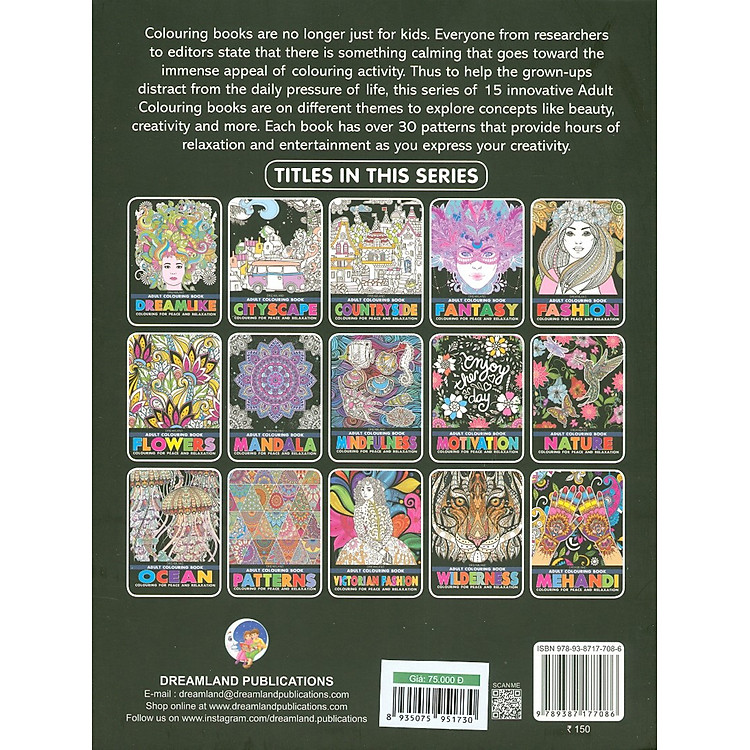 Sách tô màu không còn chỉ dành cho trẻ em. Tất cả mọi người từ các nhà nghiên cứu đến các nhà biên tập đều nói rằng điều gì đó êm dịu hướng đến sự hấp dẫn to lớn của hoạt động tô màu. Do đó, để giúp người lớn phân tâm khỏi sự căng thẳng của cuộc sống hàng ngày, cuốn sách tô màu sáng tạo dành cho người lớn này về các chủ đề khác nhau khám phá các khái niệm như vẻ đẹp, sự sáng tạo và hơn thế nữa. Mỗi cuốn sách có hơn 30 mẫu mang đến những giờ thư giãn và giải trí trong khi bạn thể hiện khả năng sáng tạo của mình.
