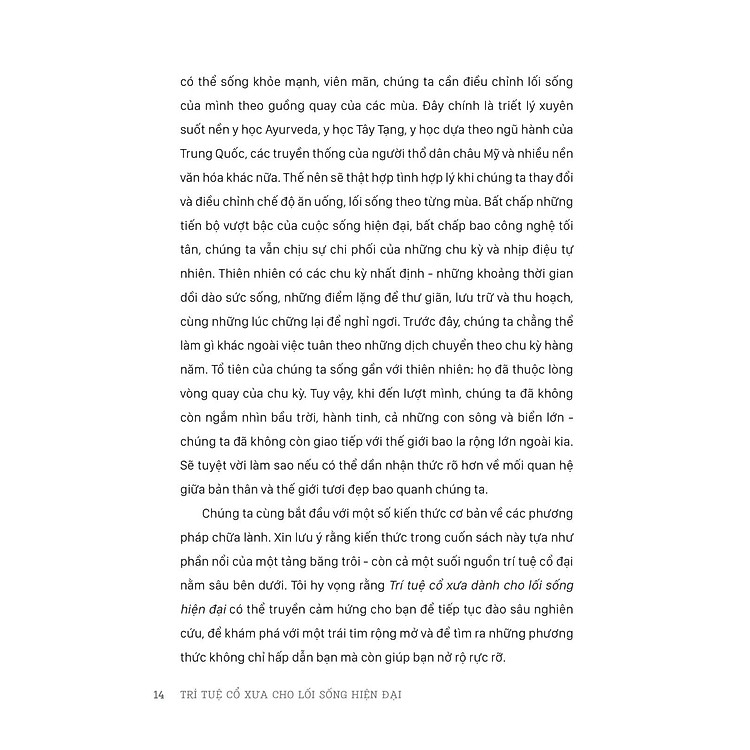 Trong thế giới kỹ thuật số thay đổi nhanh đến chóng mặt, ai cũng đang cố gắng kiếm tìm sự cân bằng và chữa lành từ sâu bên trong. Với cuốn sách được chia thành các mùa trong năm, Trí tuệ cổ xưa cho lối sống hiện đại giới thiệu đến bạn các nền văn hóa xa xưa và cách ứng dụng chúng để đạt được sức khỏe toàn diện và sự vững vàng trong cuộc sống: