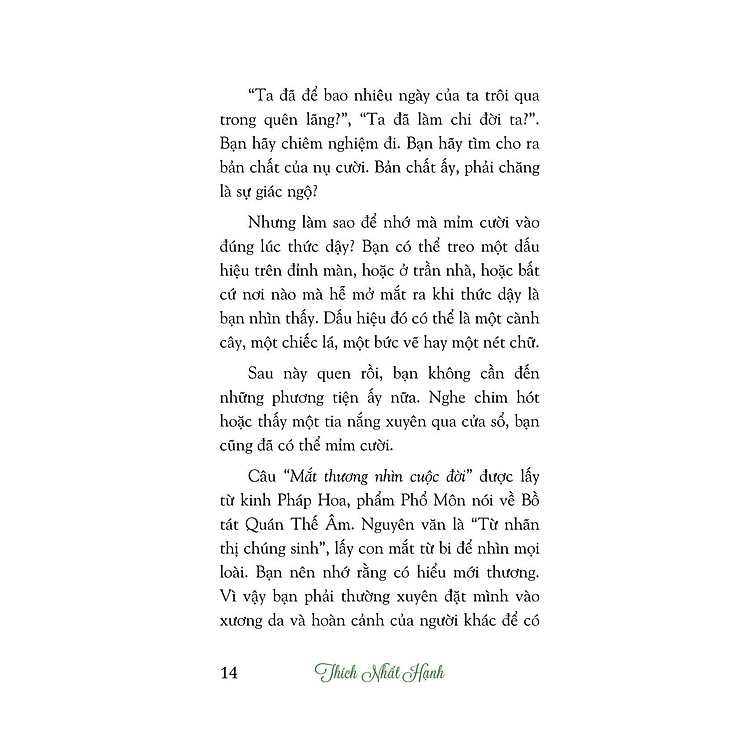 Câu “Mắt thương nhìn cuộc đời” được lấy từ kinh Pháp Hoa, phẩm Phổ Môn nói về Bồ tát Quán Thế Âm. Nguyên văn là “Từ nhãn thị chúng sinh”, lấy con mắt từ bi để nhìn mọi loài. Bạn nên nhớ rằng có hiểu mới thương. Vì vậy bạn phải thường xuyên đặt m.ình vào xương da và hoàn cảnh của người khác để có thể hiểu được họ. Thương là một quá trình học hỏi và thực tập. Bản chất của thương cũng là bản chất của giác ngộ, đồng thể với bản chất của nụ cười.