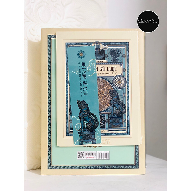Ấn bản cao cấp Việt Nam sử lược có bìa cứng, ruột in 2 màu trên giấy GV76-BB định lượng 100gsm, quà tặng kèm gồm bản đồ, bookmark và bộ postcard 8 tấm.