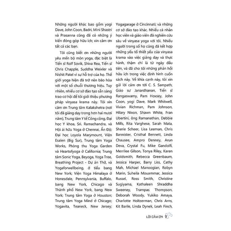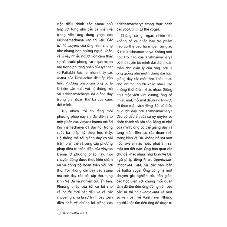 Phần mở đầu của sách là những chia sẻ của tác giả về quá trình 33 năm học tập dưới trướng T. Krishnamacharya, người sáng tạo ra trường phái Vinyasa yoga, và cùng với những chia sẻ cá nhân của ông sau hơn hai thập kỷ làm việc dưới cương vị giáo viên Yoga. Sau đó chúng ta đến nội dung chính của cuốn sách là 12 chương tương ứng cho 12 trình tự động tác cùng với 1000 ảnh màu minh họa rõ nét động tác và quy trình thở dưới những lời hướng dẫn chi tiết của tác giả.