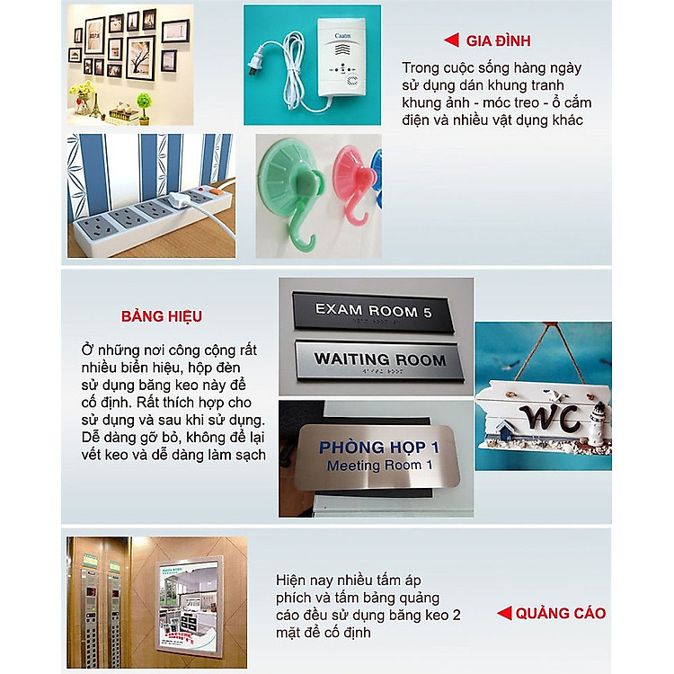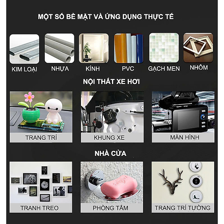 - Hướng dẫn sử dụng: Làm sạch bề mặt, cắt băng keo, ép chặt và cố định trong 24h.
