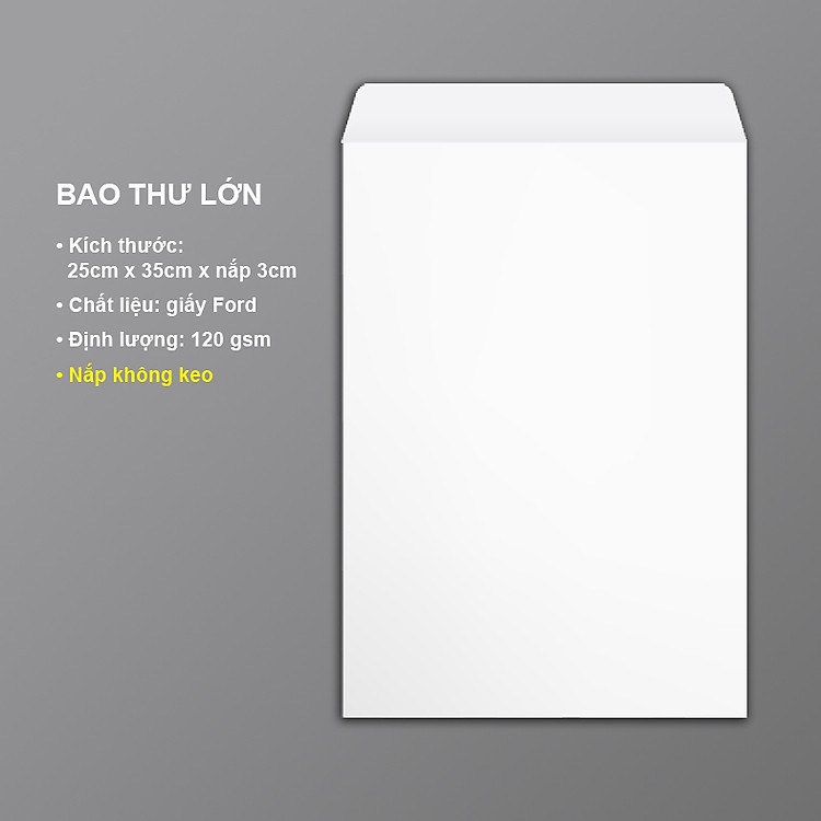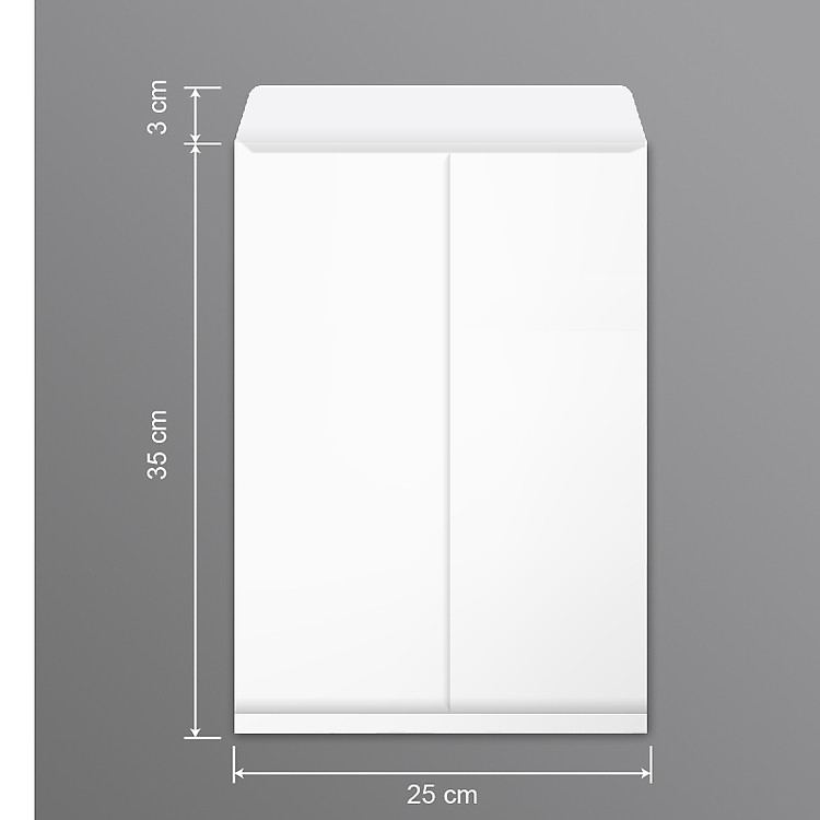 - Bao thư trắng khổ A4, kích thước 25cm x 35cm, nắp ngang 3cm.