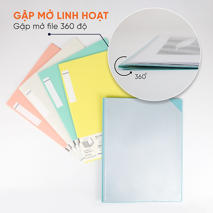 Bìa lá 10 túi Slim Book Switch AO+ là sản phẩm được thiết kế tối ưu công năng nhỏ gọn, tiện dụng. Bìa có thể gập 360 độ dễ dàng cầm bằng một tay; túi được thiết kế cắt góc giúp lấy tài liệu dễ dàng nhanh chóng.