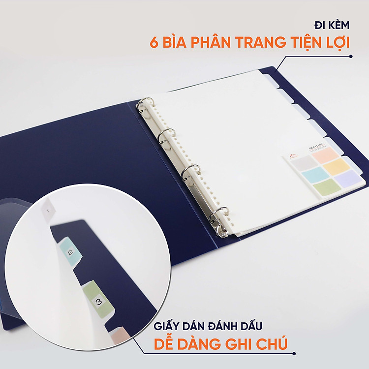 - Sản phẩm kèm: 6 Bìa phân trang tiện lợi; Bộ giấy dán phân trang 6 màu; Túi lỗ chất lượng Nhật Bản.