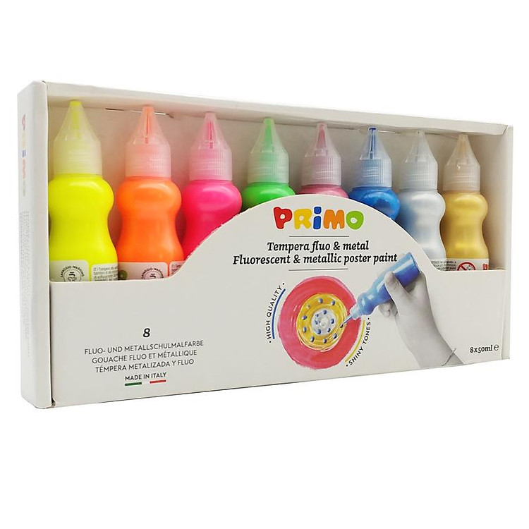 Bộ 8 Chai Màu Poster Paint Chất Lượng Cao 75ml (4 Màu Dạ Quang, 4 Màu Kim Loại) PRIMO 2532FM8
