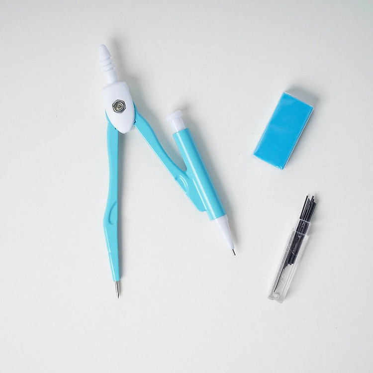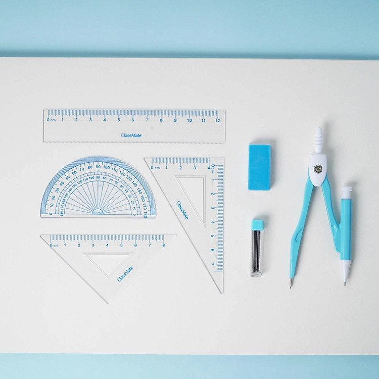 - Gồm 01 compas kim loại, chì kim tiện lợi, 01 viên tẩy, và bộ thước eke 12cm.