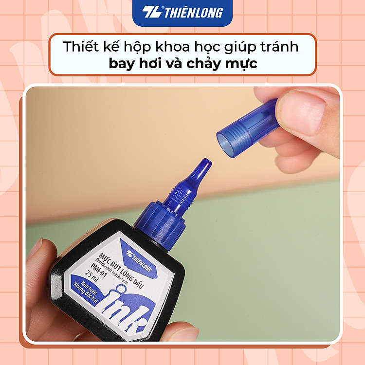 Hộp mực bút lông dầu Thiên Long PMI-01 có màu mực tươi sáng, bám dính tốt và bền màu với ánh sáng. Sản phẩm có thiết kế hộp khoa học giúp tránh bay hơi và chảy mực.