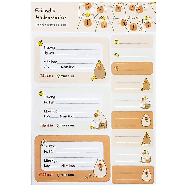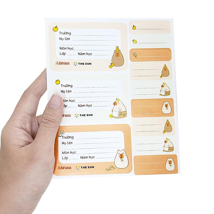 - Bộ 15 nhãn vở học sinh 3 ô từ thương hiệu The Sun, thiết kế hình Capybara dễ thương.