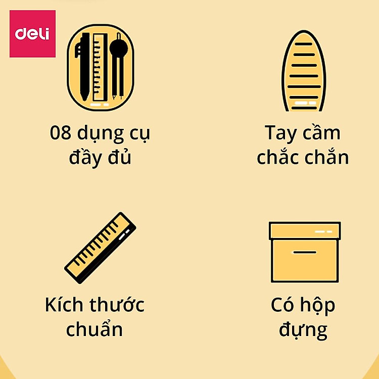 - Bộ thước kẻ và compa Deli gồm 8 món, thiết kế nhỏ gọn, tiện lợi cho học sinh.