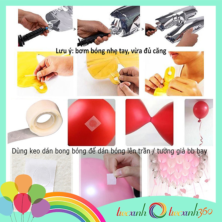 - Có thể bơm khí helium để bong bóng bay hoặc sử dụng keo dán để cố định bong bóng lên trần.