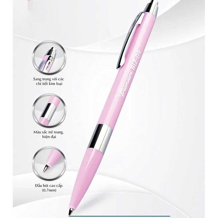 - Bút Bi BIZ-09 – Mực Xanh với thiết kế đơn giản, thân tròn, dễ cầm nắm.