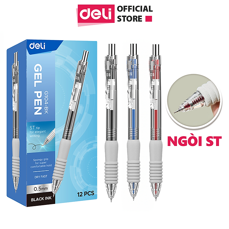 - Bút gel Deli với nhiều màu sắc đa dạng (Đen, Xanh, Đỏ).