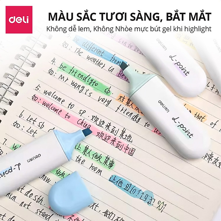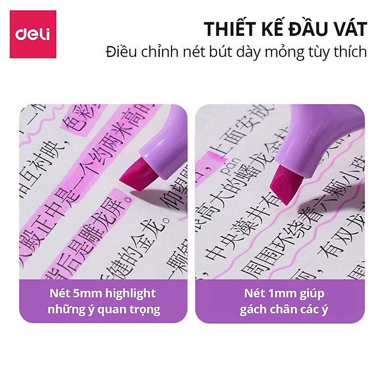 - Bút Highlight Deli với màu mực tươi sáng và sắc màu rực rỡ.