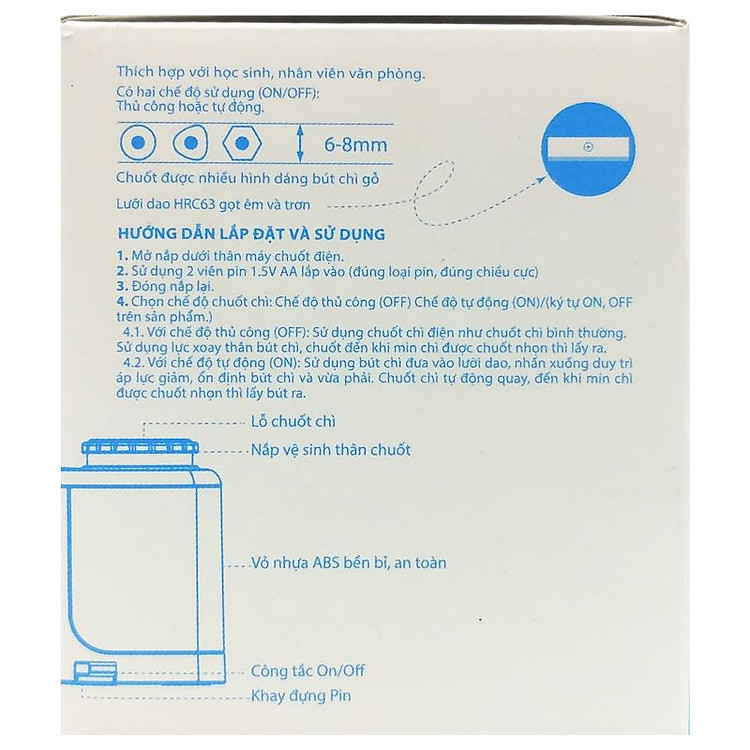 4.1. Với chế độ thủ công (OFF): Sử dụng chuốt chì điện như chuốt chì bình thường. Sử dụng lực xoay thân bút chì, chuốt đến khi min chì được chuốt nhọn thì lấy ra,