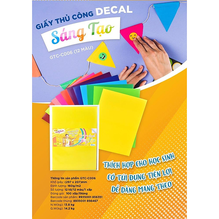 Bộ sản phẩm bao gồm 12 tờ với 12 màu sắc đa dạng tươi sáng và phong cách giúp bé thoải mái sáng tạo theo ý thích của mình. Cấu tạo giấy decal rất dễ dàng sử dụng, bạn chỉ cần cắt hình dạng theo ý thích hoặc xé dán một cách nhanh chóng. Sản phẩm được bảo quản trong túi đựng hồ sơ tiện lợi và dễ dàng mang theo.