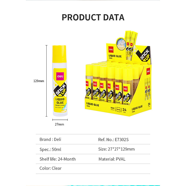 - Hồ nước Deli, mã sản phẩm E7302S, có màu vàng, cung cấp 24 lọ/hộp.