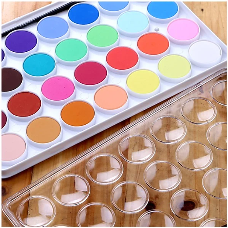 được đựng trong khay nhựa giúp dễ dàng nhận biết màu và pha trộn các màu với nhau. Khay gồm 36 bánh màu với sắc màu cơ bản,