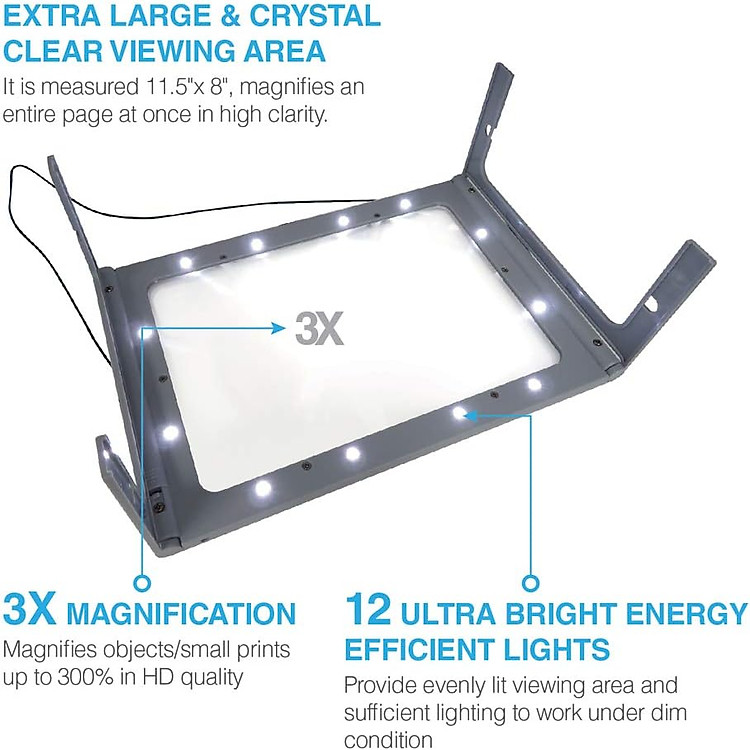 Kính lúp là một khung phóng đại khổ lớn mạnh mẽ. Dụng cụ kính lúp hỗ trợ này có thấu kính acrylic linh hoạt với độ phóng đại gấp 3 lần và có khung đỡ. MagniPros 3X cực kỳ mỏng và cực kỳ nhẹ, vì vậy bạn có thể dễ dàng mang theo bên mình ở bất cứ đâu. Kính lúp có thể dùng Pin AAA hoặc nguồn ngoài qua cáp cổng USB.