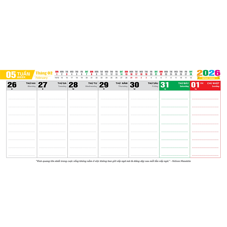 - Lịch Tết 2026 với kích thước 13 x 28 cm, phù hợp cho bàn làm việc và kệ sách.