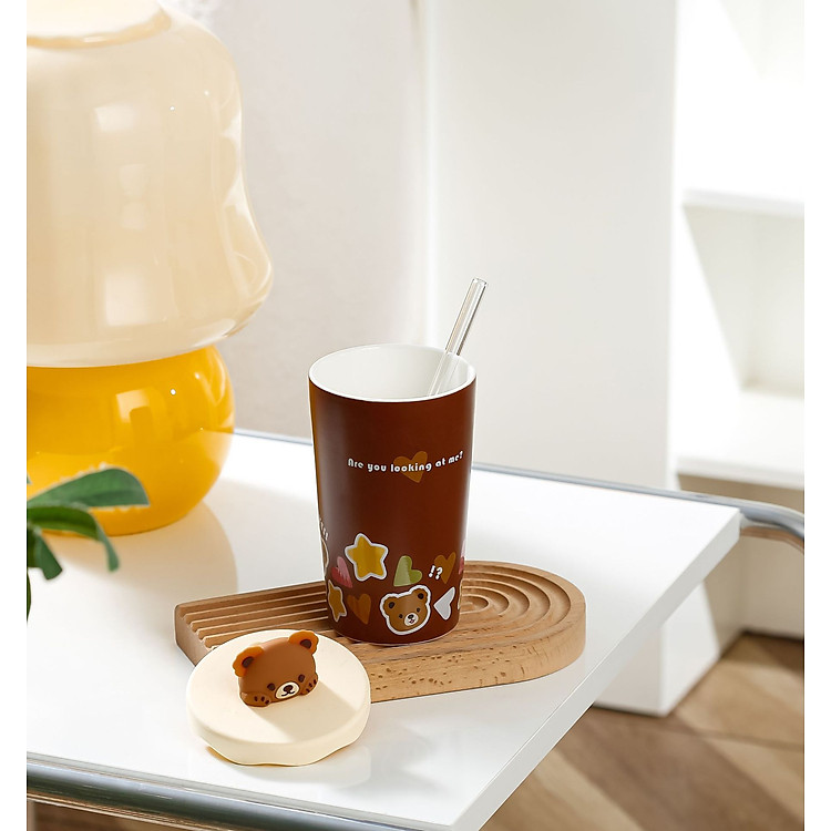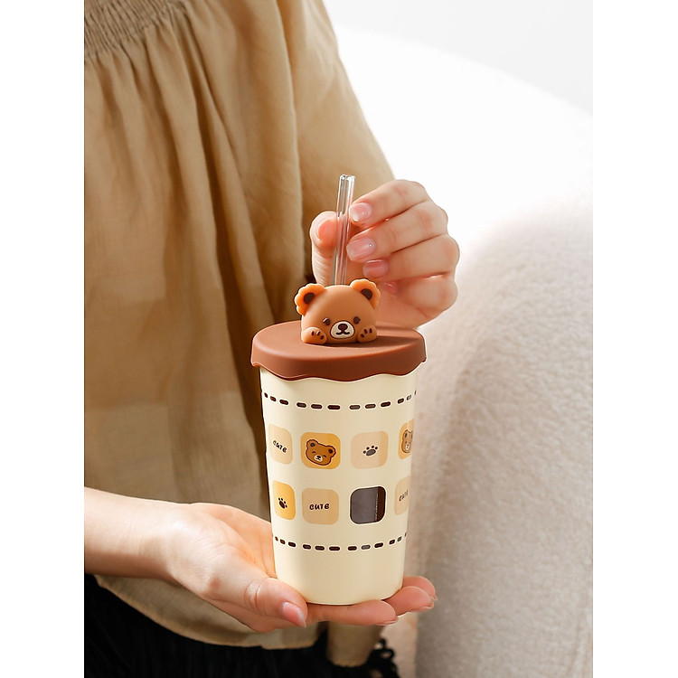 Ly gốm sứ dáng cao đầu gấu kèm nắp silicon 420ml (Nâu)