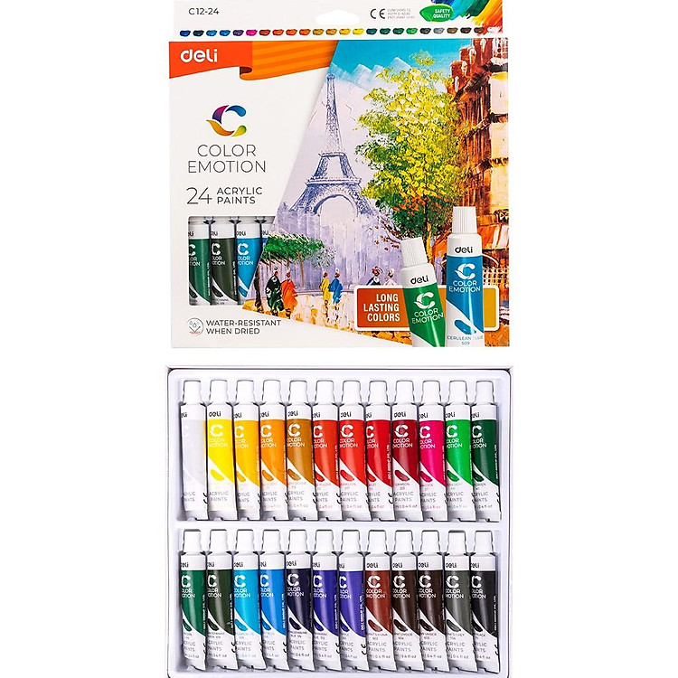 - Màu nước Acrylic dạng tuýp 12ml, sản xuất và phân phối độc quyền bởi Deli.