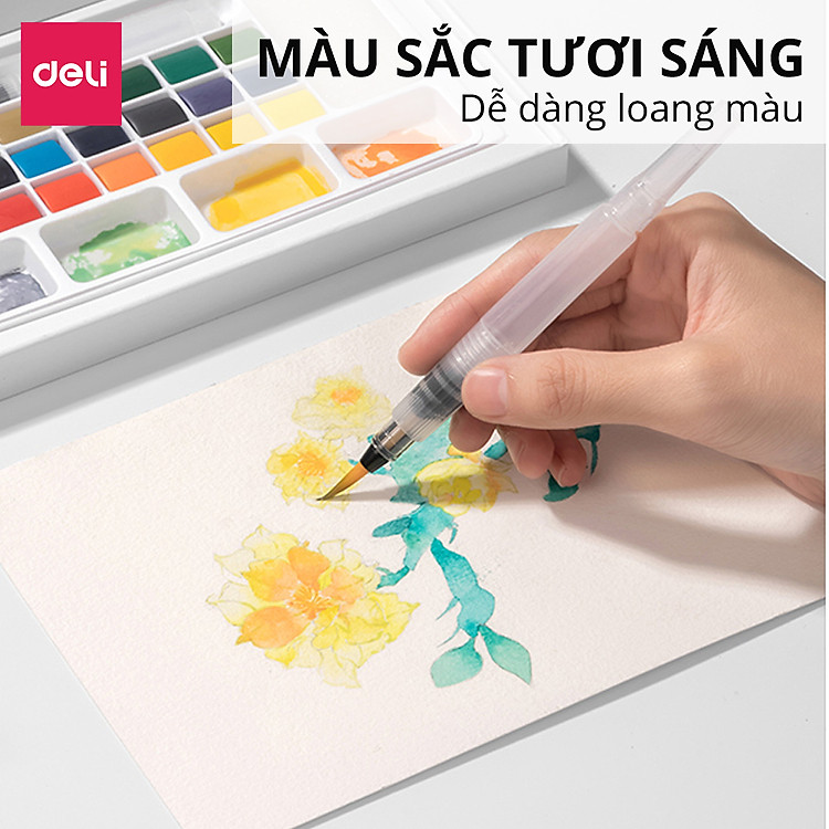 - Bộ màu nước dạng nén cao cấp gồm 24 màu, dễ dàng hòa tan với nước.
