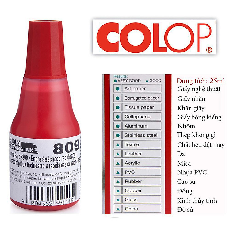 - Mực COLOP 809 là mực dầu đặc biệt nhanh khô, bền màu và bám chắc trên nhiều chất liệu.