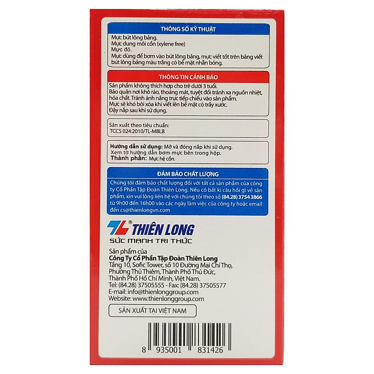 Mực Lông Bảng WBI-01 – Mực Đỏ dùng để bơm mực cho các loại bút lông lông bảng, để sử dụng tiết kiệm hơn. Bình mực bút lông bảng WBI-01 là sản phẩm thuộc dòng văn phòng phẩm. Sản phẩm mang nhãn hiệu Thiên Long được sản xuất bởi Tập đoàn Thiên Long.