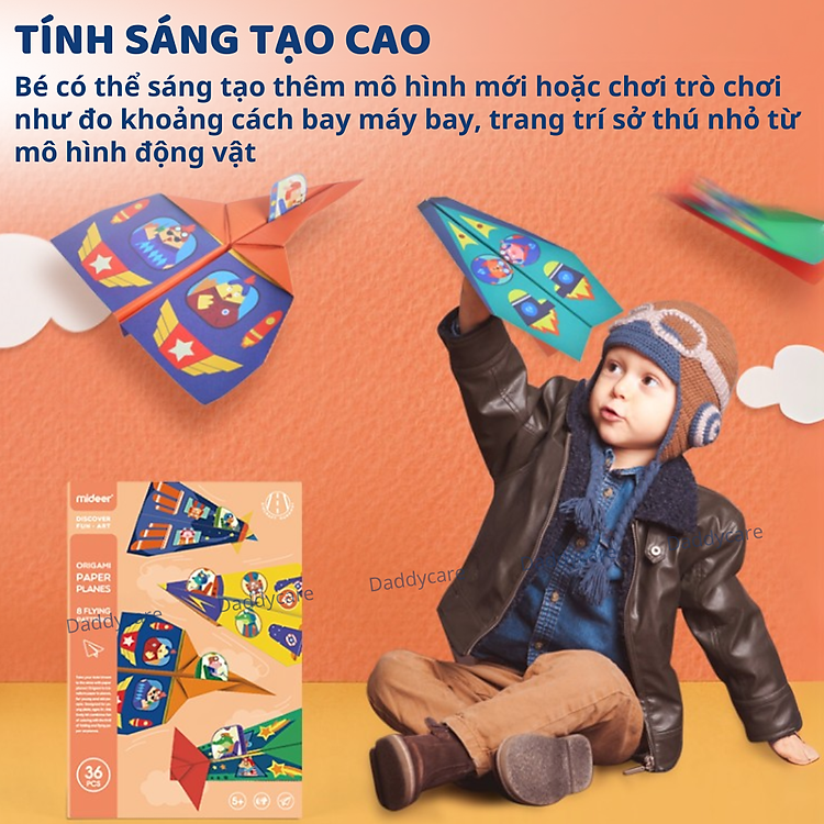– Tự Do Sáng Tạo: 12 tờ giấy sáng tạo cho phép trẻ thỏa sức thiết kế và gấp những mẫu máy bay riêng theo ý thích.