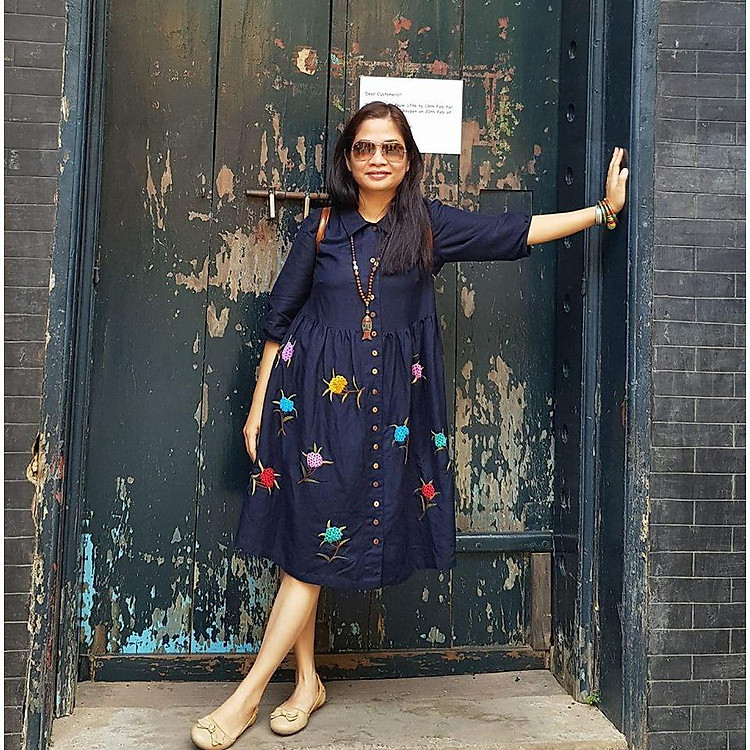 - Rập đầm dáng babydoll gài nút trước, cổ sen nhọn, tay phồng lửng.
