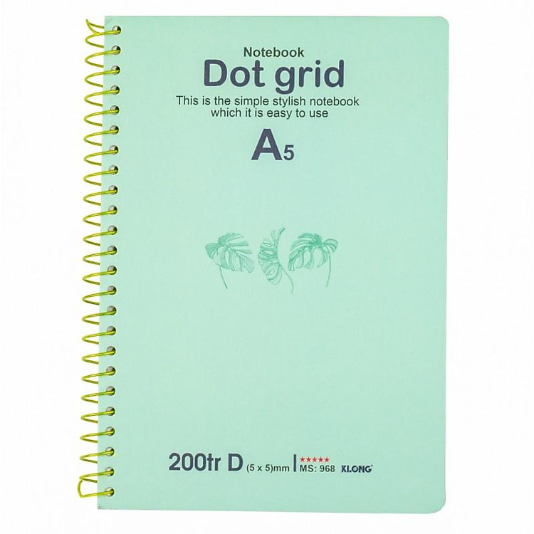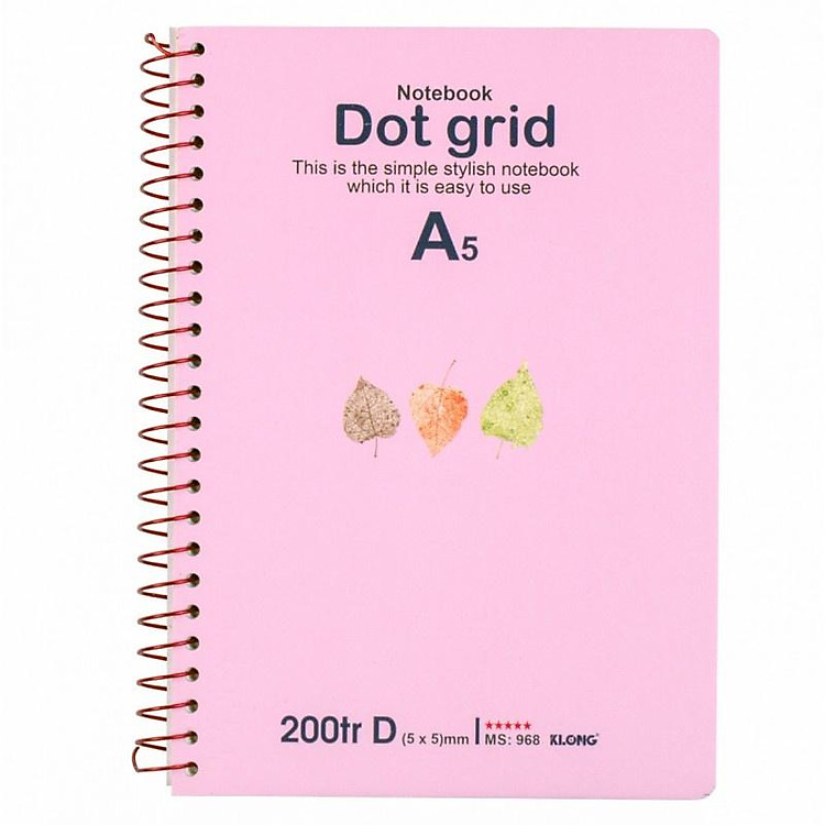 - Sổ Dot Grid lò xo đơn KLONG A5 với 200 trang, kích thước 148 x 210 mm.
