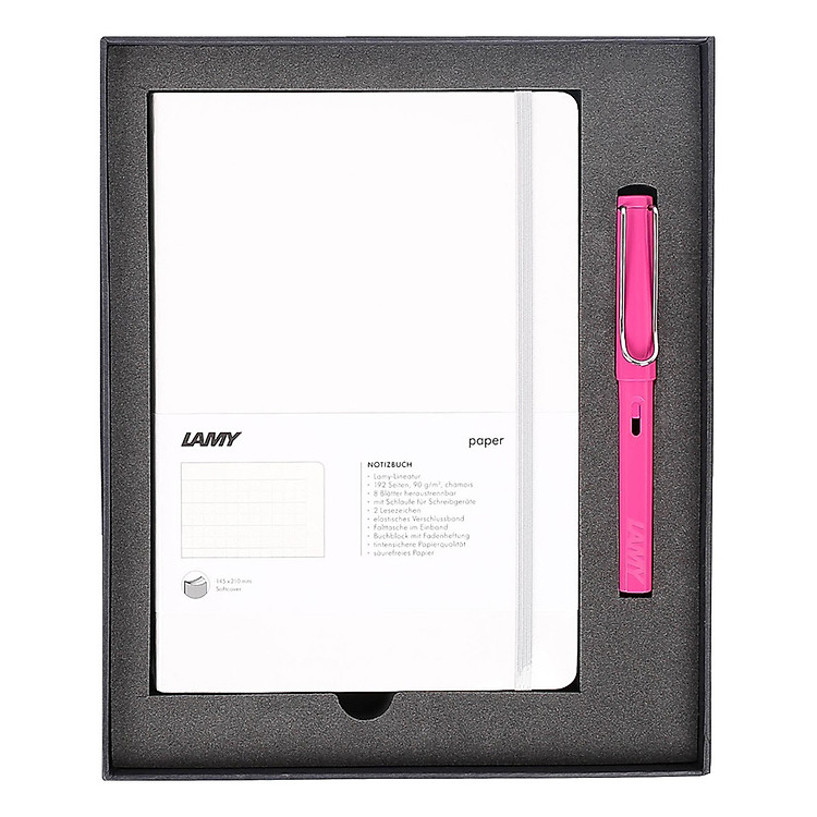 - Bộ quà tặng LAMY bao gồm sổ tay A5 Softcover và bút máy LAMY Safari màu hồng.
