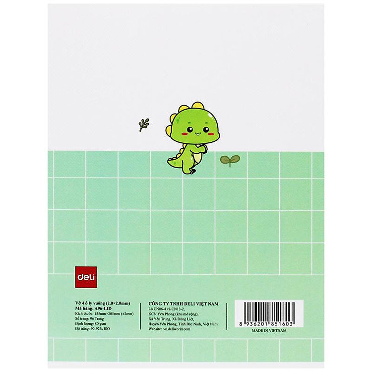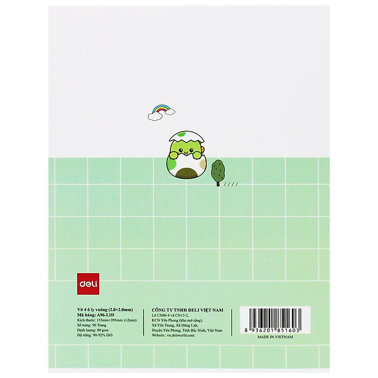 - Tập Học Sinh Deli CNA96-LID có 4 ô ly vuông, kích thước 156 x 205 mm.