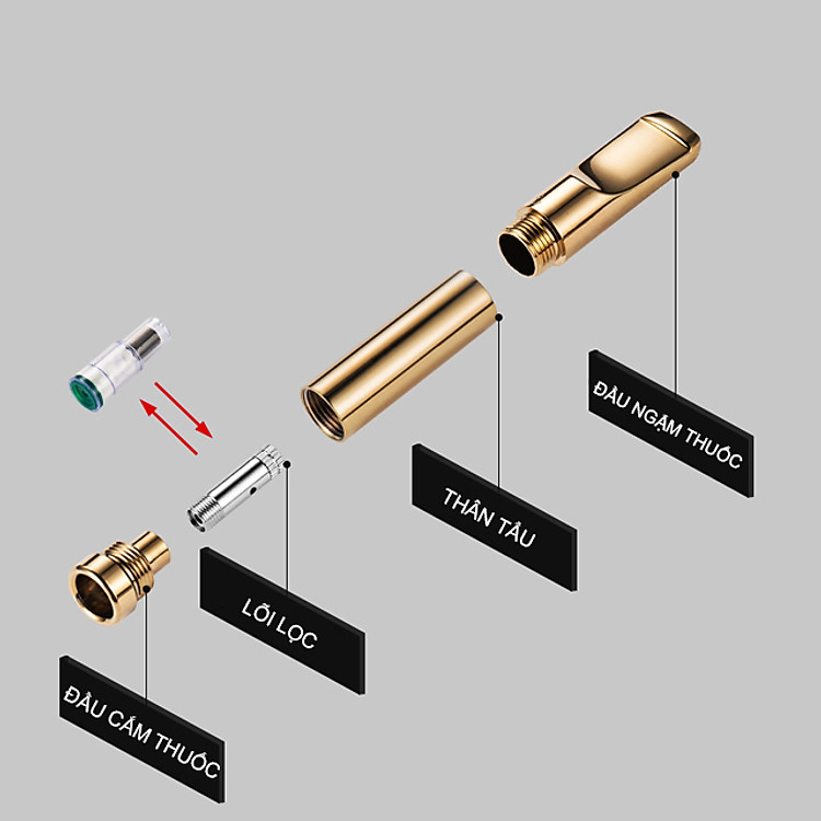 - Chất liệu: Thân, nõ và đầu tẩu làm từ kim loại; lõi lọc từ hạt hoặc kim loại.