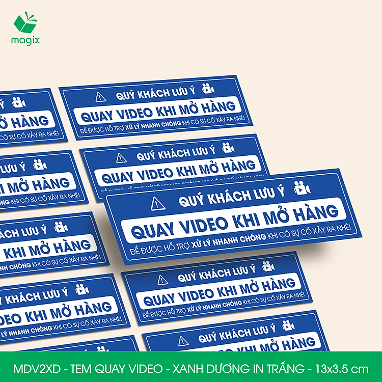 - Tên sản phẩm: Tem chú ý quay video trước khi mở hàng, decal dán hộp – 13×3,5 cm – Màu xanh dương in trắng.